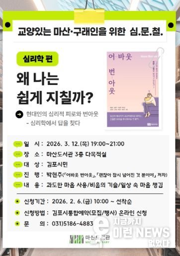 이런뉴스(e-runnews) 김삼성 기자 | 김포시 마산도서관은 심리적 피로와 번아웃을 주제로 한 인문교양 강연 '왜 나는 쉽게 지칠까?'를 오는 3월 12일 오후 7시부터 9시까지 마산도서관 3층 다목적실에서 운영한다.