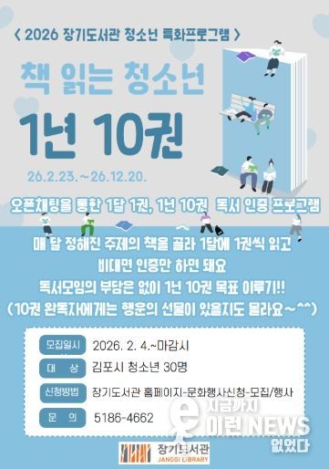 이런뉴스(e-runnews) 김삼성 기자 | 김포시 장기도서관은 청소년의 자발적인 독서 습관 형성을 위해 청소년 특화프로그램 ‘책 읽는 청소년 1년 10권’을 오는 2월 23일부터 연말까지 운영한다.