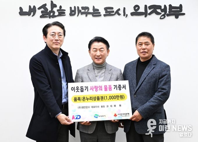 이런뉴스(e-runnews) 김삼성 기자 | 의정부시는 2월 4일 KD운송그룹이 설 명절을 앞두고 어려운 이웃을 돕기 위해 1천만 원 상당의 온누리상품권을 기탁했다고 밝혔다.