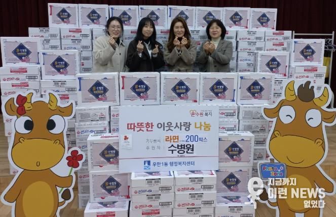 이런뉴스(e-runnews) 김삼성 기자 | 수병원은 지난 4일, 설 명절을 맞아 어려운 이웃들을 위해 라면 200박스를 우만1동 행정복지센터에 기부하며 이웃사랑을 실천했다.