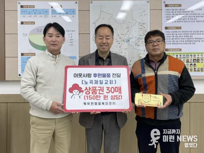 이런뉴스(e-runnews) 김삼성 기자 | 연천군 백학면 노곡제일교회는 지난 4일 백학면행정복지센터를 방문해 설 명절을 맞아 소외계층에게 전달해달라며 농촌사랑상품권 150만 원을 기탁했다.