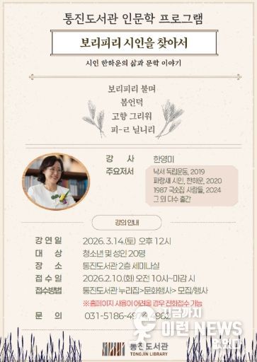 이번 강의는 2월 10일 오전 10시부터 통진도서관 누리집에서 신청할 수 있으며, 한하운 시인에 대해 관심 있는 청소년 및 성인 20명을 선착순으로 모집한다.