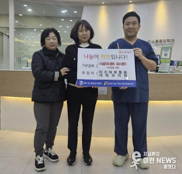 김영희 망포1동장은 “지속적인 관심과 나눔을 실천해 주시는 미소마취통증의학과의원에 깊이 감사드린다”며 “기부해 주신 따뜻한 마음이 이웃들의 몸과 마음 모두에 큰 힘이 될 것”이라고 감사의 뜻을 밝혔다.
