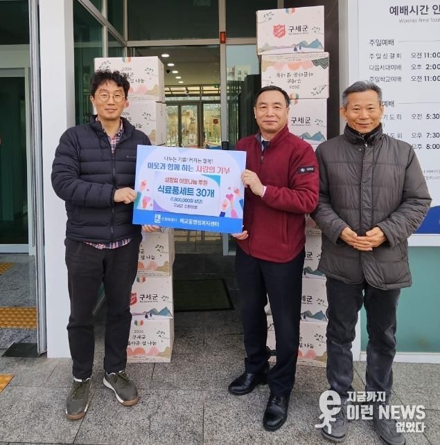 이런뉴스(e-runnews) 김삼성 기자 | 지난 5일, 구세군수원영문에서 수원시 팔달구 매교동에 설 명절을 앞두고 풍성한 명절 분위기를 조성하여 기쁨을 나누고자 관내 어려운 이웃들에게 180만원 상당의 식료품 선물 세트 30박스를 후원했다.