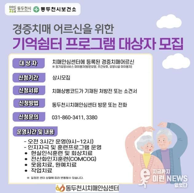 이런뉴스(e-runnews) 김삼성 기자 | 동두천시치매안심센터는 경증 치매 환자를 대상으로 ‘기억쉼터 프로그램’ 1기 참여자를 모집한다고 밝혔다. 프로그램은 2026년 3월 9일부터 5월 12일까지 운영된다.