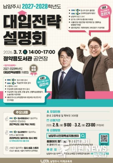 이런뉴스(e-runnews) 김삼성 기자 | 남양주시는 오는 3월 7일 정약용도서관 공연장에서 관내 고등학생과 학부모를 대상으로 ‘남양주시 2027~2028학년도 대입전략설명회’를 열고, 이에 앞서 2월 9일부터 참가 신청 접수를 진행한다.