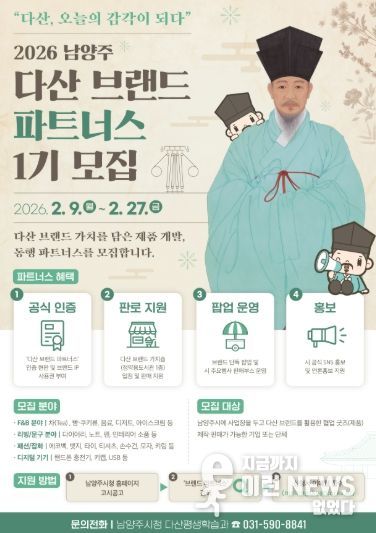 이런뉴스(e-runnews) 김삼성 기자 | 남양주시는 실학의 거장 정약용을 21세기 감각으로 되살린 브랜드 굿즈를 개발하는‘2026 다산 브랜드 파트너스’1기를 오는 2월 9일부터 27일까지 모집한다.