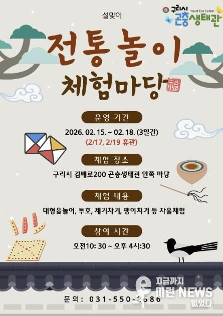 이런뉴스(e-runnews) 김삼성 기자 | 구리시는 민족 최대의 명절 설을 맞아 오는 2월 15일부터 18일까지 구리시 곤충생태관에서 ‘2026 설맞이 전통 놀이 체험 마당’을 운영한다고 밝혔다.