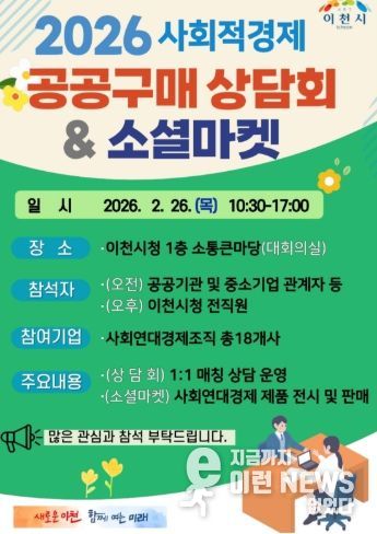 이런뉴스(e-runnews) 김삼성 기자 | 이천시는 오는 2월 26일 오전 10시 30분부터 오후 5시까지, 이천시청 1층 소통큰마당에서 사회적경제 공공구매 활성화를 위한 ‘사회적경제 공공구매 상담회&소셜마켓’ 행사를 운영한다고 밝혔다.
