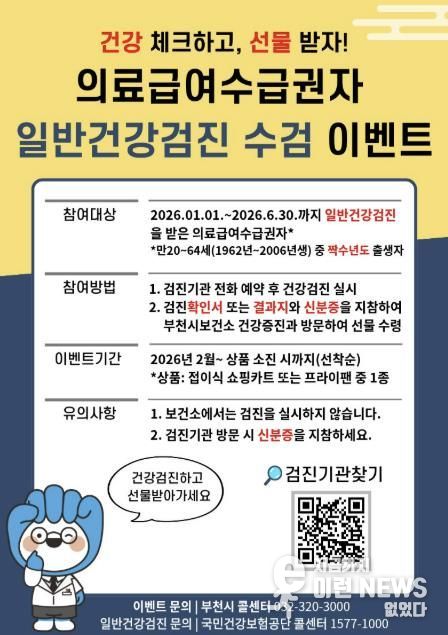 이런뉴스(e-runnews) 김삼성 기자 | 부천시는 의료급여수급권자의 국가건강검진 참여를 확대하기 위해 일반건강검진 수검 이벤트를 진행한다고 9일 밝혔다. 의료급여수급권자 가운데 검진 대상자가 자신의 건강 상태를 확인하고 만성질환을 조기에 관리할 수 있도록 돕기 위한 취지다.