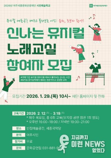 이런뉴스(e-runnews) 김삼성 기자 | 여주세종문화관광재단은 오는 12일부터 시민예술학교 프로그램의 일환으로 ‘신나는 뮤지컬 노래교실’을 운영한다.