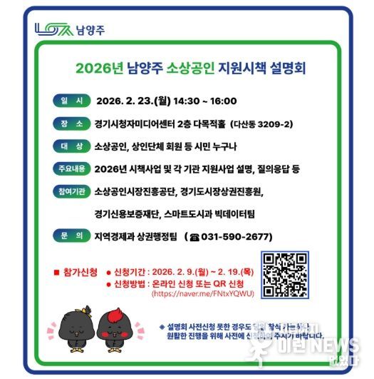 한편, 이번 설명회 참여를 희망하는 소상공인 및 상인단체는 남양주시청 누리집 메인 배너를 통해 오는 19일까지 인터넷(QR코드) 접수하면 된다.