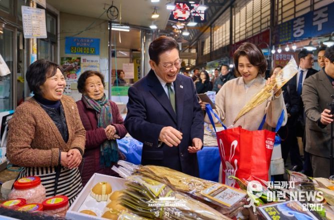 이런뉴스(e-runnews) 김삼성 기자 | 이재명 대통령과 김혜경 여사는 오늘 낮, 설 명절을 앞두고 충북 충주시에 위치한 무학시장을 찾아 지역 세밑 물가를 점검하고 상인들을 만나 현장 의견을 청취했다.