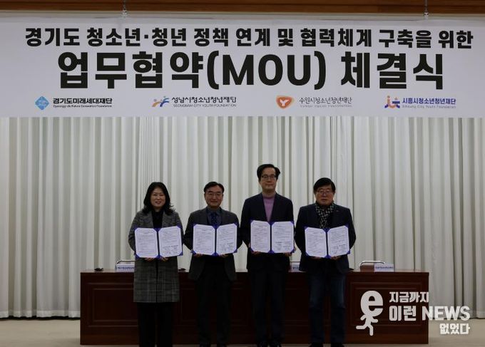 이런뉴스(e-runnews) 김삼성 기자 | 경기도미래세대재단은 12일 옛 경기도청사 신관 4층 대회의실에서 수원·성남·시흥시청소년청년재단과 ‘경기도 청년 정책 연계 및 협력체계 구축 업무협약’을 체결했다.