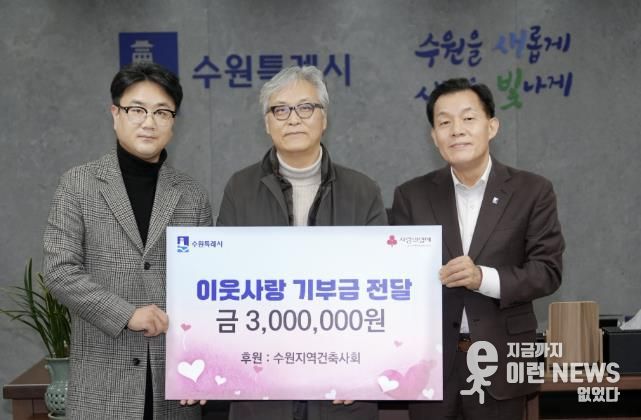 이웃돕기성금 300만 원은 수원지역건축사회 회원 137명이 모금해 마련했다. 수원지역건축사회는 2024년에도 이웃돕기성금 300만 원을 기부한 바 있다.