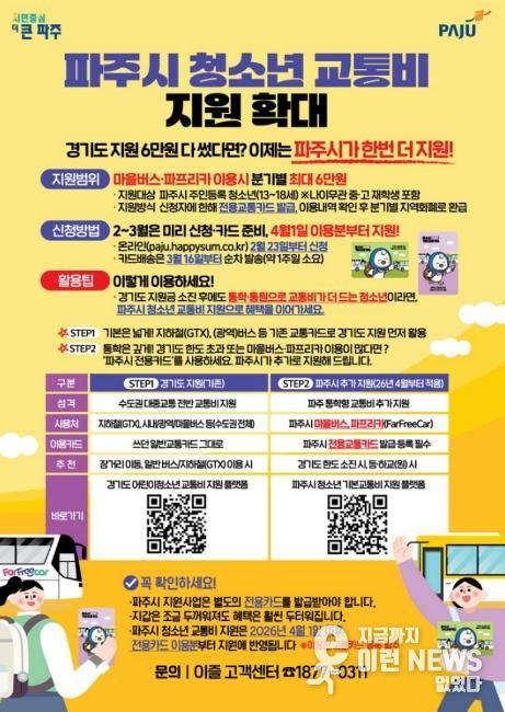 이런뉴스(e-runnews) 김삼성 기자 | 파주시는 청소년의 통학 교통비 부담을 실질적으로 줄이기 위해 기존 경기도 청소년 교통비 지원사업과 별개로, 파주시 여건에 맞춘 ‘파주시 청소년 기본교통비 지원사업(파프렌즈)’을 오는 4월부터 시행한다.