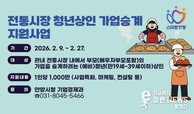 이런뉴스(e-runnews) 김삼성 기자 | 안양시가 전통시장에 젊은 활력을 불어넣고 청년 상인의 안정적인 정착을 돕기 위해 ‘2026년 전통시장 청년상인 가업승계 지원사업’을 추진한다고 13일 밝혔다.