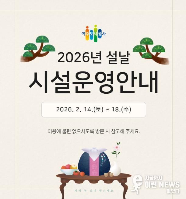 이런뉴스(e-runnews) 김삼성 기자 | 여주도시공사가 다가오는 2026년 설 연휴를 맞아 시민과 귀성객들이 안전하고 편안한 명절을 보낼 수 있도록 주요 시설 운영시간 조정 및 특별 서비스를 시행한다고 밝혔다.