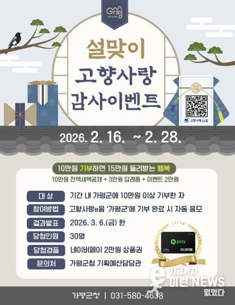 가평군은 설 명절을 맞아 고향사랑기부제 참여 분위기 확산과 기부 활성화를 위해 ‘설맞이 고향사랑 감사이벤트’를 추진한다고 13일 밝혔다.