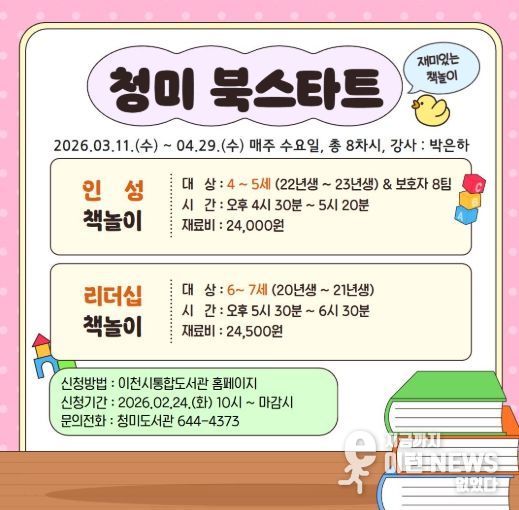 이런뉴스(e-runnews) 김삼성 기자 | 이천시립청미도서관은 오는 3월 11일부터 4월 29일까지, 유아와 보호자를 대상으로 ‘상반기 북스타트 책놀이’ 프로그램을 운영한다.