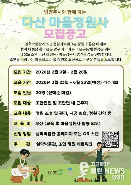 교육을 진행하는 조안정원네트워크 배호영 대표는 서울시 조경과장으로 서울숲과 월드컵공원 조성을 이끈 전문가다. 은퇴 후에는 남양주시 조안면에서 이로가든스쿨을 운영하며 정원문화 확산을 위한 활동을 이어오고 있다. 배 대표는 “실학박물관의 지역 연계가 단순한 의견 수렴에 머물지 않고, 마을정원사 양성과 커뮤니티 정원 조성이라는 실제 사업으로 이어져 매우 뜻깊다”며 “정원과 꽃을 매개로 이웃과 함께 아름다운 마을을 일구어 갈 분들의 참여를 환영한다”고 말했다.