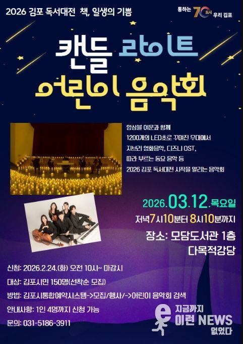 이런뉴스(e-runnews) 김삼성 기자 | 김포시 도서관은 2026 김포 독서대전의 시작을 알리는 공연으로 '캔들 라이트 어린이 음악회'를 2026년 3월 12일 19시 10분부터 20시 10분까지 모담도서관 1층 다목적강당에서 진행한다.