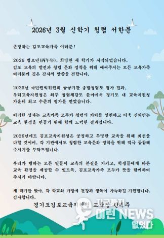 이런뉴스(e-runnews) 김삼성 기자 | 김포교육지원청은 2026년 3월 신학기를 맞아 관내 학교를 대상으로 ‘교육장 청렴 서한문’을 발송했다고 밝혔다.