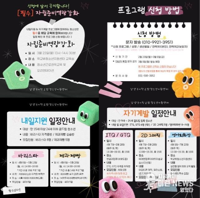 프로그램 신청과 관련한 기타 문의 사항은 남양주시 학교밖청소년지원센터로 문의하면 안내 받을 수 있다.