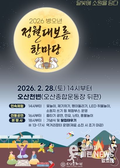 이런뉴스(e-runnews) 김삼성 기자 | 오산시는 오는 28일 오후 2시부터 오산천 일원(오산종합운동장 뒤편)에서 시민과 함께하는 ‘2026 병오년 정월대보름 한마당’을 개최한다고 밝혔다.