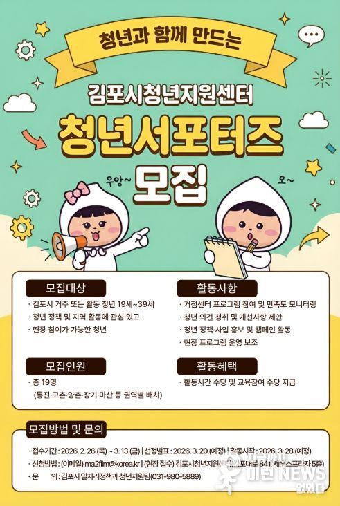 이런뉴스(e-runnews) 김삼성 기자 | 김포시는 청년지원센터 거점 프로그램 운영 현장의 청년 참여를 확대하기 위해, ‘청년서포터즈’ 를 공개모집한다. 모집기간은 2월 26일부터 3월 13일까지다.