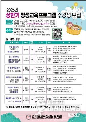 이런뉴스(e-runnews) 김삼성 기자 | 경기도교육청성남도서관이 학생, 학부모, 다문화 청소년 및 어르신을 대상으로‘2026년 상반기 평생교육 프로그램’을 운영한다.