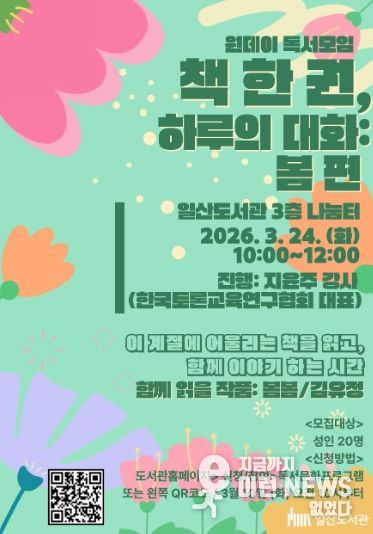 이런뉴스(e-runnews) 김삼성 기자 | 고양특례시는 오는 3월 24일 오전 10시부터 12시까지 일산도서관 3층 나눔터에서 성인 20명을 대상으로 원데이 독서토론 프로그램 ‘책 한 권, 하루의 대화: 봄 편’을 운영한다고 밝혔다.