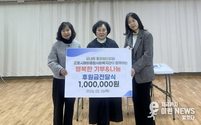 이런뉴스(e-runnews) 김삼성 기자 | 군포시 궁내동통장협의회는 지난 2월 26일 매화종합사회복지관에 후원금 100만원을 전달했다.