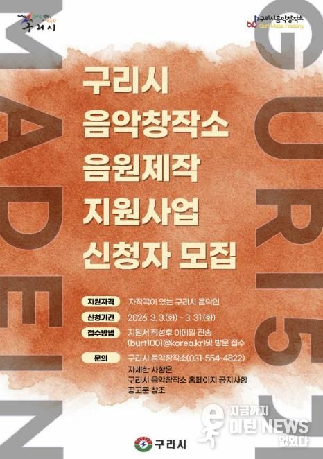 이런뉴스(e-runnews) 김삼성 기자 | 구리시는 3월부터 추진하는 구리시 음악창작소 지역 아마추어 음악가 음원 제작 지원사업 '2026 Made in Guri(메이드 인 구리)’참여자를 모집한다고 밝혔다.