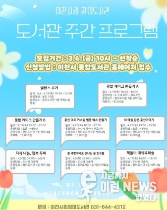 이런뉴스(e-runnews) 김삼성 기자 | 이천시 청미도서관에서는 오는 4월 1일부터 30일까지 제62회 도서관 주간을 맞아 ‘도서관 속 작은 펼침, 세상을 여는 큰 열림’이라는 주제로 시민들이 즐길 수 있는 체험, 공연, 전시 프로그램을 운영한다.