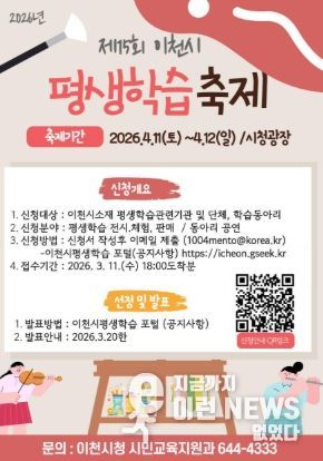 부스 및 공연 참가 신청은 3월 11일까지 접수하며, 신청서 양식은 이천시 평생학습 포털 내 소식정보(공지사항)에서 내려받을 수 있다. 심사 결과는 평생학습실무추진위원회 심사를 거쳐 3월 중 발표될 예정이다.
