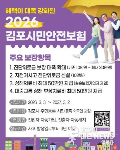 이런뉴스(e-runnews) 김삼성 기자 | 김포시는 3월 3일부터 시민들이 일상생활 중 겪을 수 있는 불의의 사고에 대비해 보장 항목을 강화한 ‘2026년 김포시민안전보험’을 시행한다고 밝혔다.
