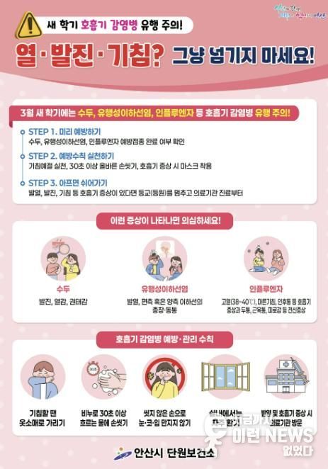 이런뉴스(e-runnews) 김삼성 기자 | 안산시 단원보건소는 새 학기를 맞아 유치원과 초·중·고등학교를 중심으로 호흡기 감염병 발생 증가가 우려됨에 따라 학생과 교직원의 각별한 주의를 당부했다.