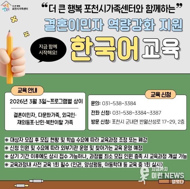 이런뉴스(e-runnews) 김삼성 기자 | 포천시 더 큰 행복 포천시가족센터는 2026년 결혼이민자 역량강화 지원 사업의 일환으로 한국어교육 과정을 수준별, 단계별 체계로 확대 개편하고 본격적인 운영에 들어갔다.
