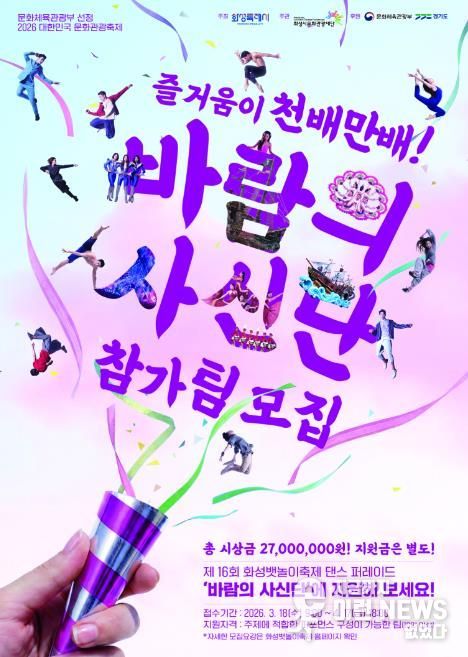 이런뉴스(e-runnews) 김삼성 기자 | (재)화성시문화관광재단은 제16회 화성 뱃놀이 축제의 주인공이 될 ‘바람의 사신단 댄스 퍼레이드‘경연 참가팀을 모집한다.