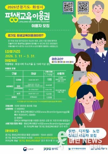 이런뉴스(e-runnews) 김삼성 기자 | 화성특례시는 평생학습 소외계층의 학습권을 보장하고 교육격차를 완화하기 위해 ‘2026년 평생교육이용권 지원사업’ 이용자 1차 모집을 오는 3월 11일부터 31일까지 실시한다고 밝혔다.