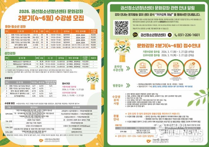 이런뉴스(e-runnews) 김삼성 기자 | 수원시청소년청년재단 권선청소년청년센터는 오는 3월 17일부터 3월 27일까지 지역사회 평생학습 문화강좌 2분기(4~6월) 수강생을 모집한다.