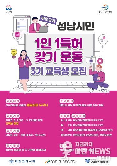 이런뉴스(e-runnews) 김삼성 기자 | 성남산업진흥원은 시민의 창의적인 아이디어를 지식재산으로 보호하고 창업으로 연결하기 위해 '성남시민 1인 1특허 갖기 운동' 제3기 교육생을 모집한다고 밝혔다.