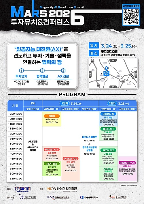 화성특례시는 오는 3월 24일부터 25일까지 이틀간 푸르미르 호텔에서 ‘MARS 2026 투자유치 & 컨퍼런스’를 개최한다고 밝혔다.