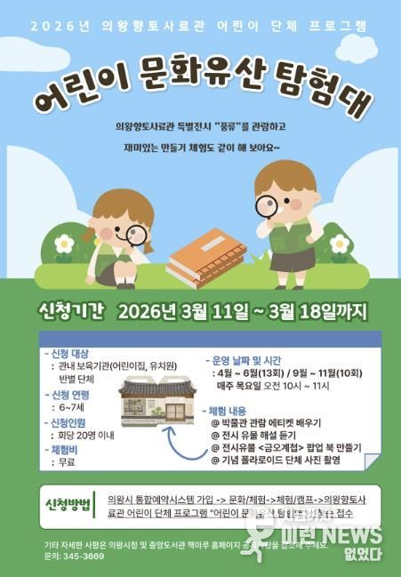 이런뉴스(e-runnews) 김삼성 기자 | 의왕시 향토사료관이 오는 4월부터 6월, 9월부터 10월 매주 목요일에 어린이 단체 체험프로그램 ‘어린이 문화유산 탐험대’를 운영한다.