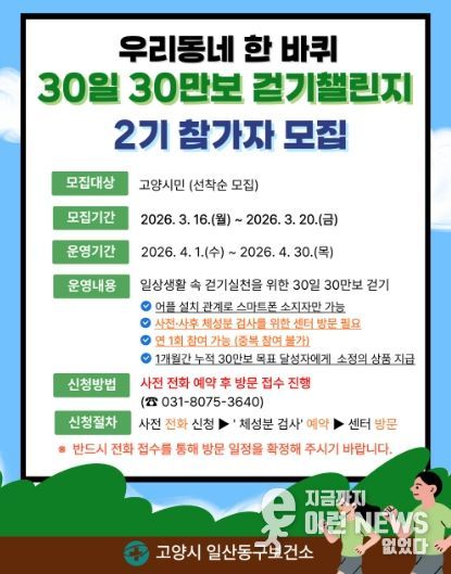 이런뉴스(e-runnews) 김삼성 기자 | 고양특례시 일산동구보건소는 지역 주민의 기초 체력 증진과 일상 속 신체활동 활성화를 위해 ‘우리동네 한 바퀴 30일 30만보 걷기 챌린지’ 2기 참가자를 오는 16일부터 모집한다고 11일 밝혔다.