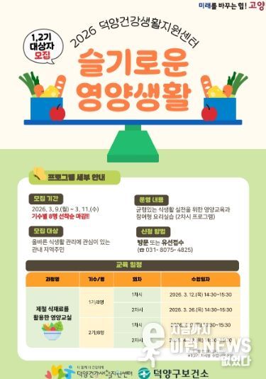 이런뉴스(e-runnews) 김삼성 기자 | 고양특례시 덕양구보건소 덕양건강생활지원센터는 지역주민의 건강한 식생활 실천을 돕기 위해 영양교육과 요리실습을 결합한 프로그램 ‘슬기로운 영양생활’ 1·2기 참여자를 모집한다.