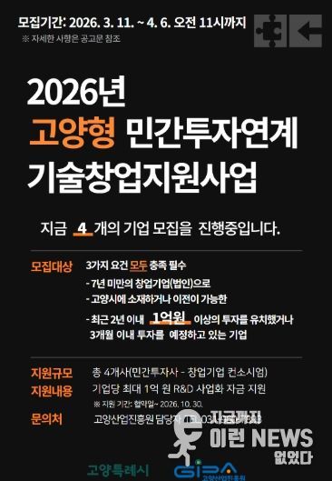 이런뉴스(e-runnews) 김삼성 기자 | 고양산업진흥원이 유망 기술창업기업의 투자 유치와 기술 고도화를 지원하기 위한 ‘2026년 고양형 민간투자연계 기술창업지원사업’에 참여할 창업기업을 모집한다.