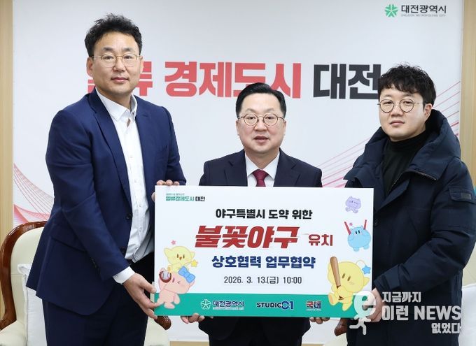 시는 13일 시청 응접실에서 스튜디오 C1 및 ㈜국대와 함께 ‘불꽃야구2’ 유치 및 한밭야구장을 우선적으로 사용하는 3자 업무협약을 체결했다.