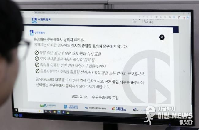 수원시는 제9회 전국동시지방선거(6월 3일) 6개월 전이었던 지난해 12월부터 모든 공직자의 선거중립의무 준수를 요청하는 공문을 수차례 발송했다.